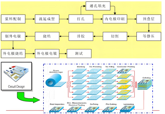 กระบวนการหลักของLTCCเทคโนโลยีมีดังนี้: ประการแรกผงเซรามิกผงแก้วและสารยึดเกาะอินทรีย์ผสมแล้วแปรรูปลงในเทปเซรามิกสีเขียวที่มีความหนาและโครงสร้างหนาแน่นที่แม่นยำผ่านการหล่อเทปการอบแห้งและกระบวนการอื่น ๆ ต่อจากนั้นรูปแบบวงจรที่ต้องการจะถูกประดิษฐ์บนเทปเซรามิกสีเขียวโดยใช้เทคโนโลยีเช่นการขุดเจาะเลเซอร์, การอัดฉีดหลุมขนาดเล็กและการพิมพ์ตัวนำที่มีความแม่นยำ ถัดไปเทปเซรามิกสีเขียวที่ผ่านการประมวลผลหลายชิ้นจะถูกลามิเนตและรวมเข้าด้วยกันและเผาในสภาพแวดล้อมที่อุณหภูมิต่ำต่ำกว่า 900 ° C ในที่สุดอุปกรณ์ชิปสามารถผลิตได้; นอกจากนี้ยังสามารถฝังส่วนประกอบพาสซีฟหลายตัวเพื่อสร้างสารตั้งต้นวงจรเซรามิกหลายมิติสามมิติเดียว นอกจากนี้ ICS และอุปกรณ์ที่ใช้งานสามารถติดตั้งบนพื้นผิวเพื่อสร้างโมดูลการทำงานแบบพาสซีฟ/แอคทีฟ เทคโนโลยีนี้สามารถส่งเสริมการย่อขนาดและความหนาแน่นสูงของวงจรและเหมาะอย่างยิ่งสำหรับการผลิตส่วนประกอบในด้านการสื่อสารความถี่สูง